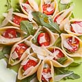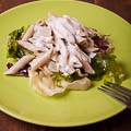 Put the stripes of chicken breasts, halves of tomatoes, halves of olives, arugula and a few leaves of basil in a large pasta bowl.